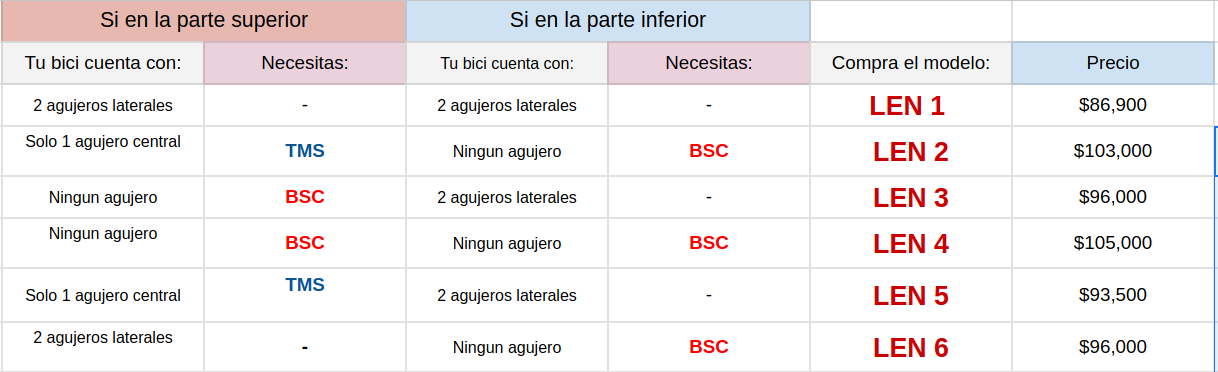 Elegi el tipo de LEN segun corresponda con tu bicicleta.